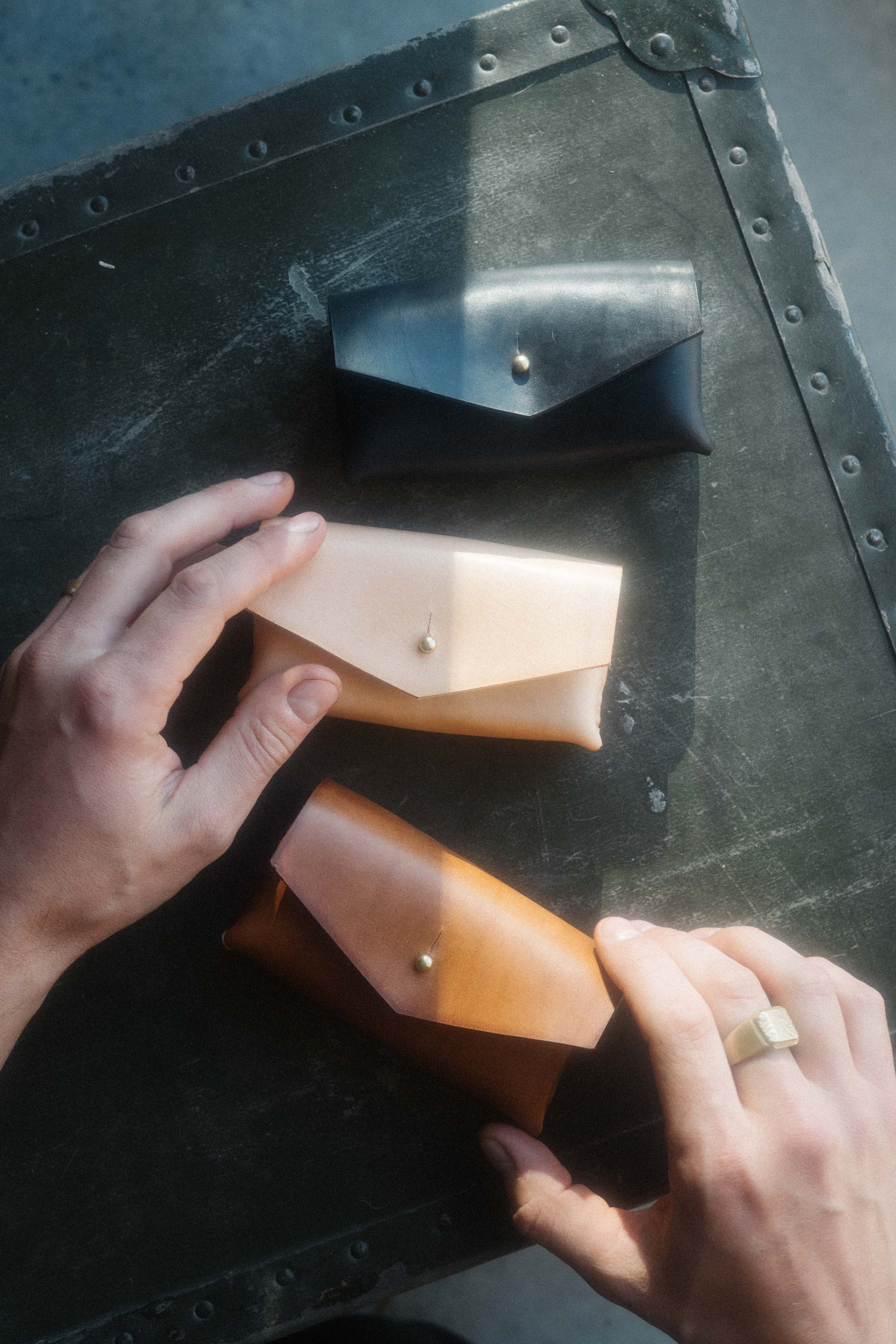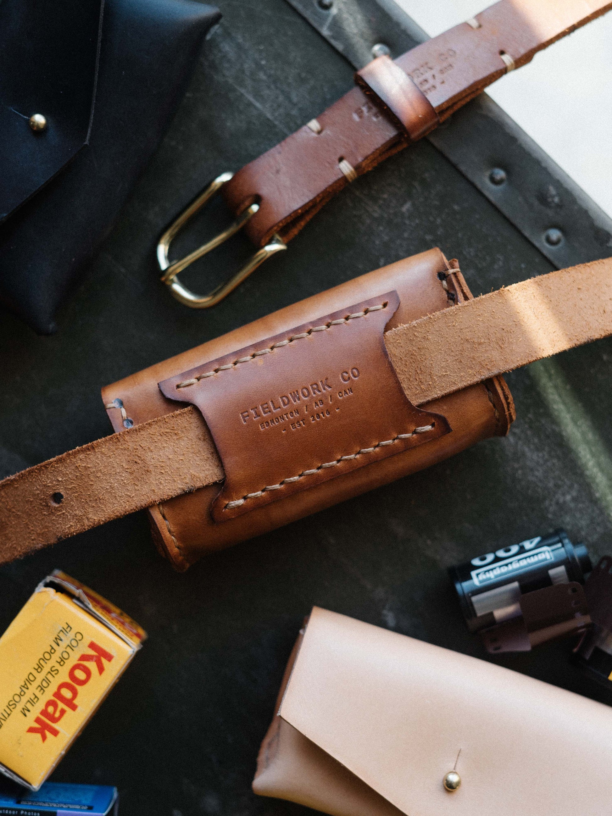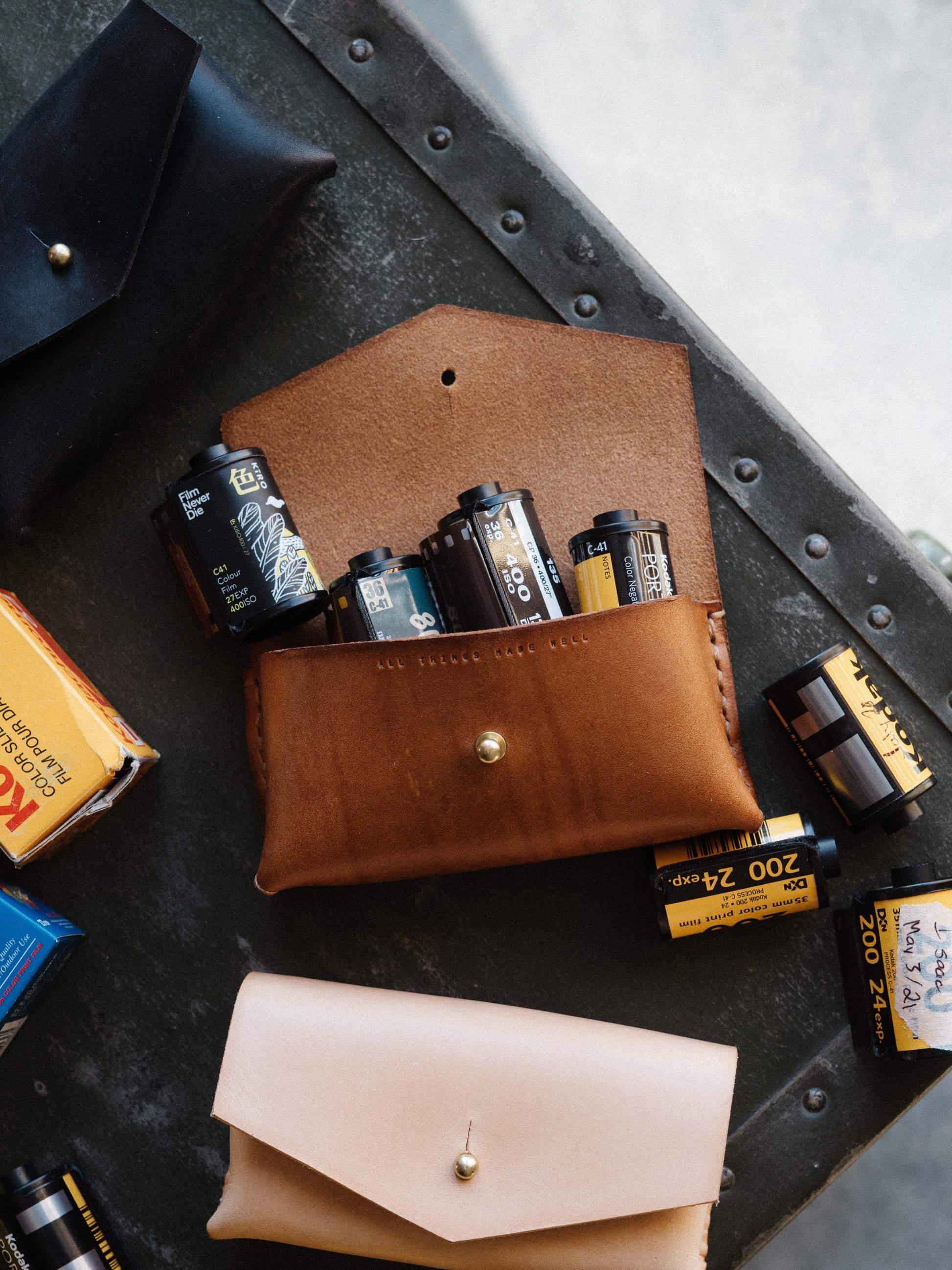 This is a really nice film pouch. Hand-made out of really nice leather, with really nice traditional saddle stitching, and old-fashioned technics. We use really nice Japanese flat waxed thread and conditioned with a really nice blend of Neatsfoot oil and a waxy hide-rejuvenator