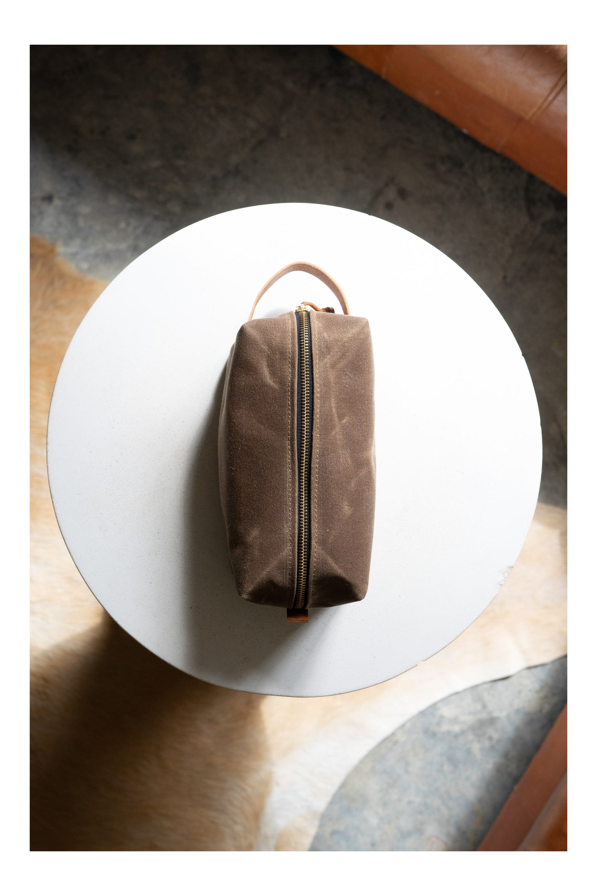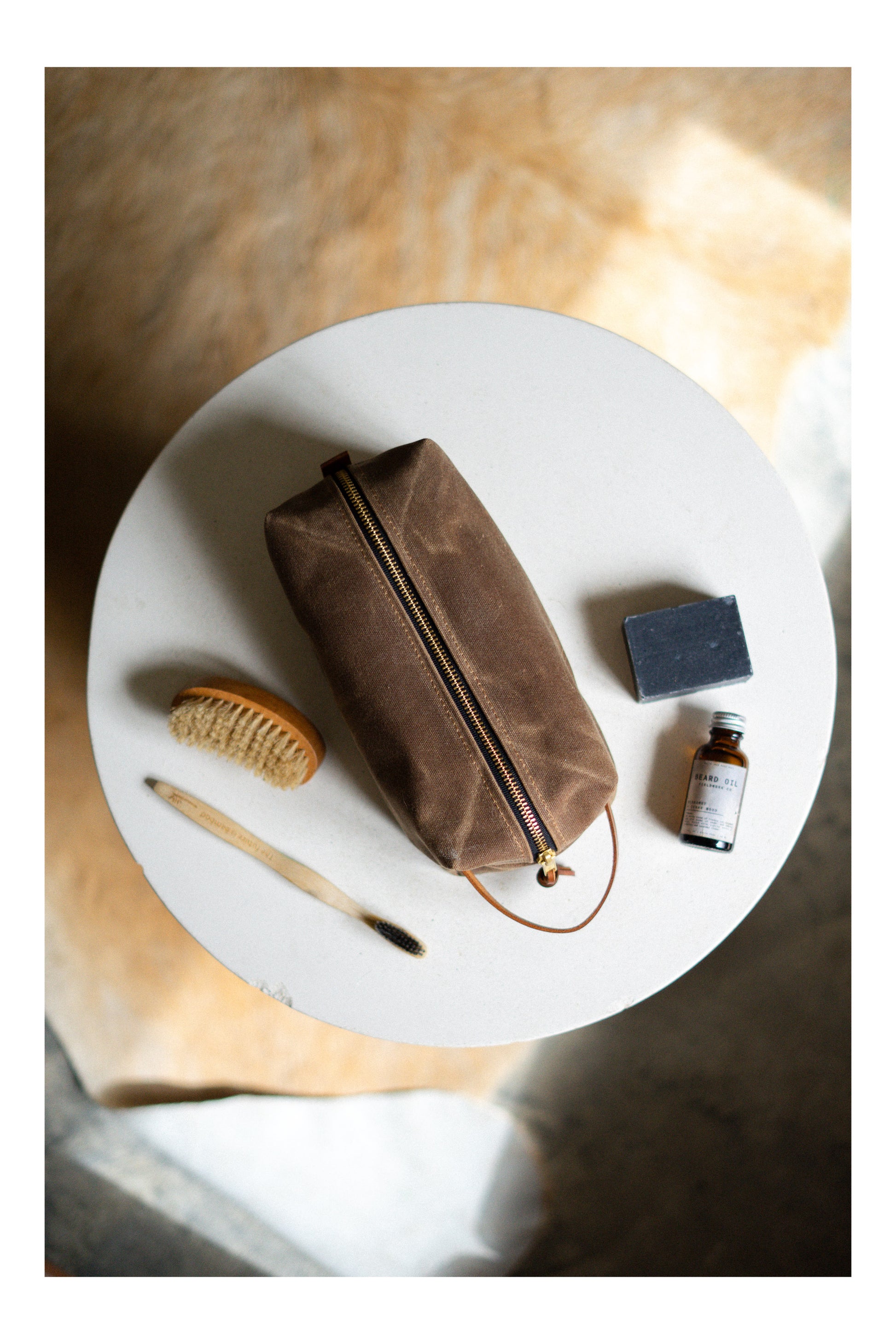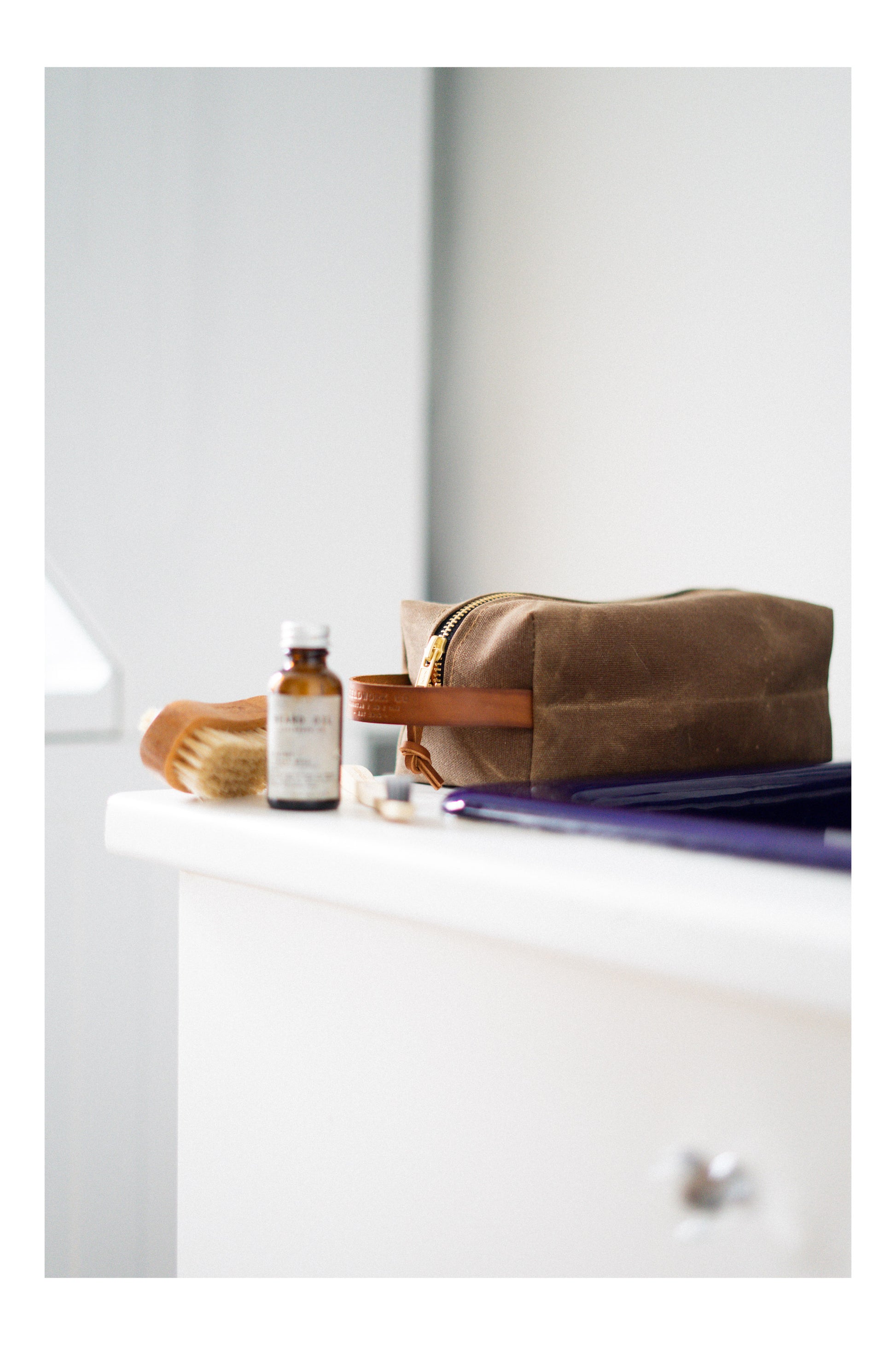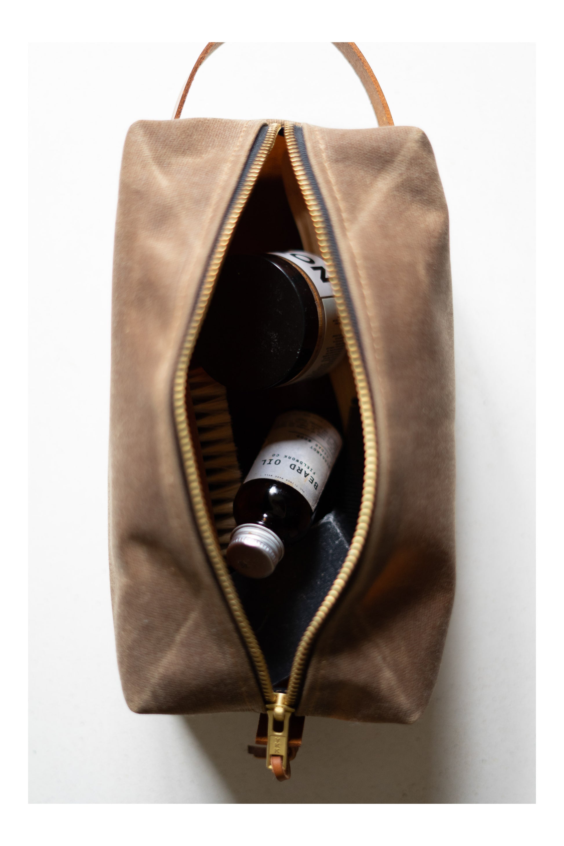 This Dopp Kit is perfect for the weekend traveller. Made out of a rugged 19oz water-resistant waxed canvas and thick vegetable tanned leather handle and details. Accompanied a solid brass YKK zipper. This bag is built to last.