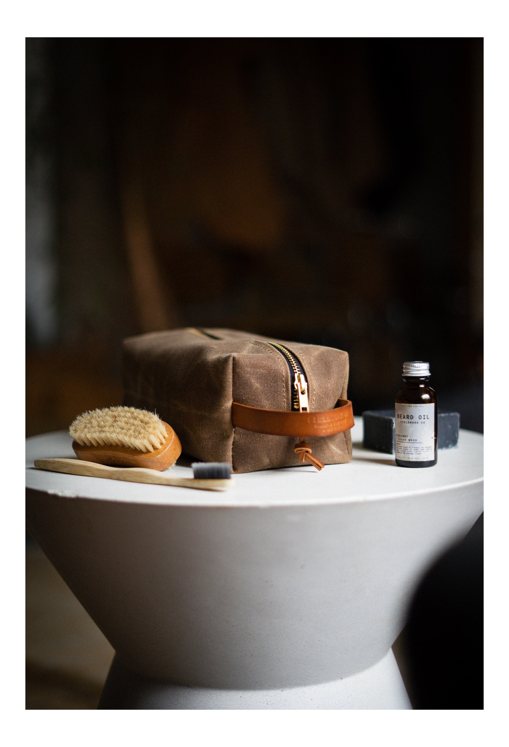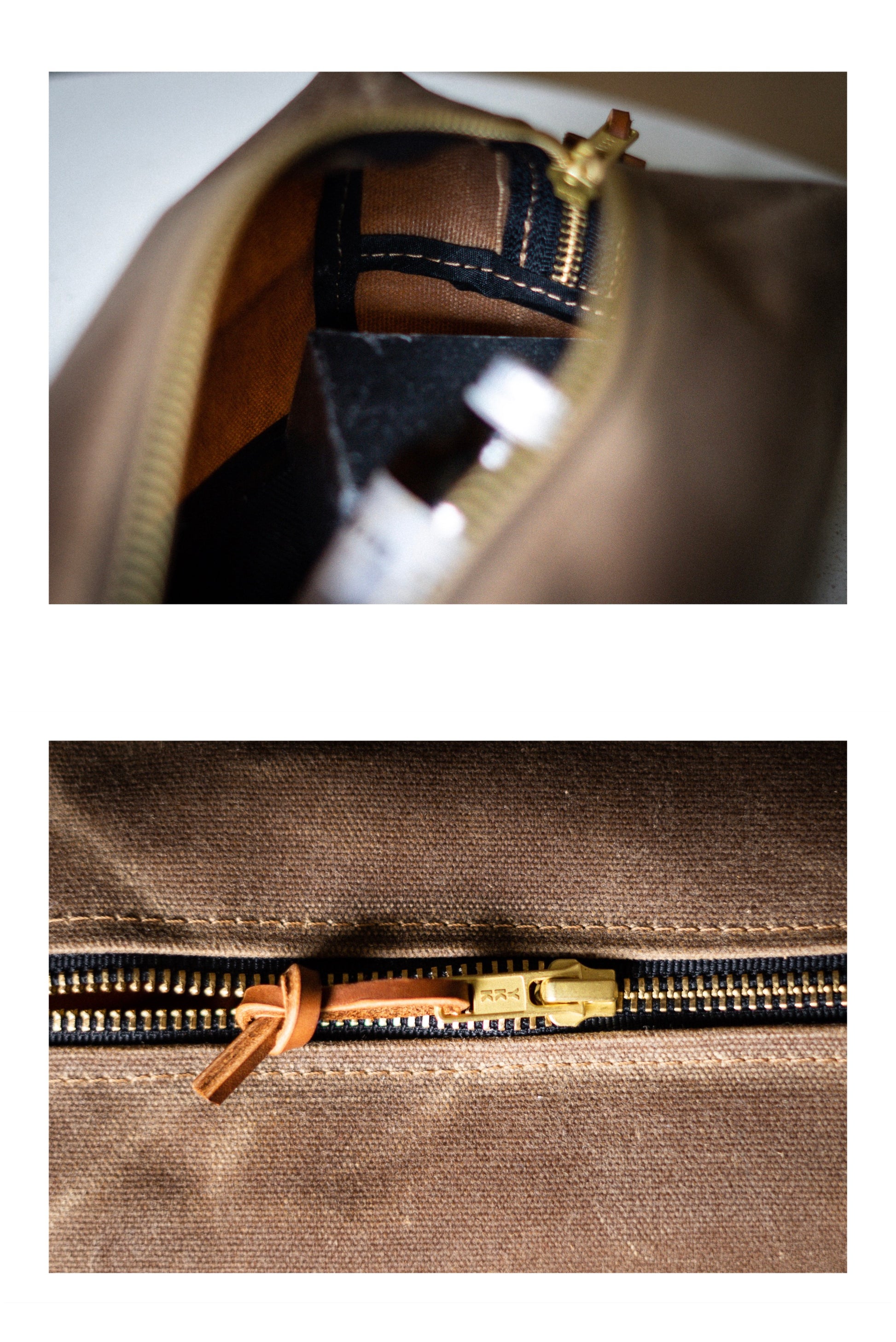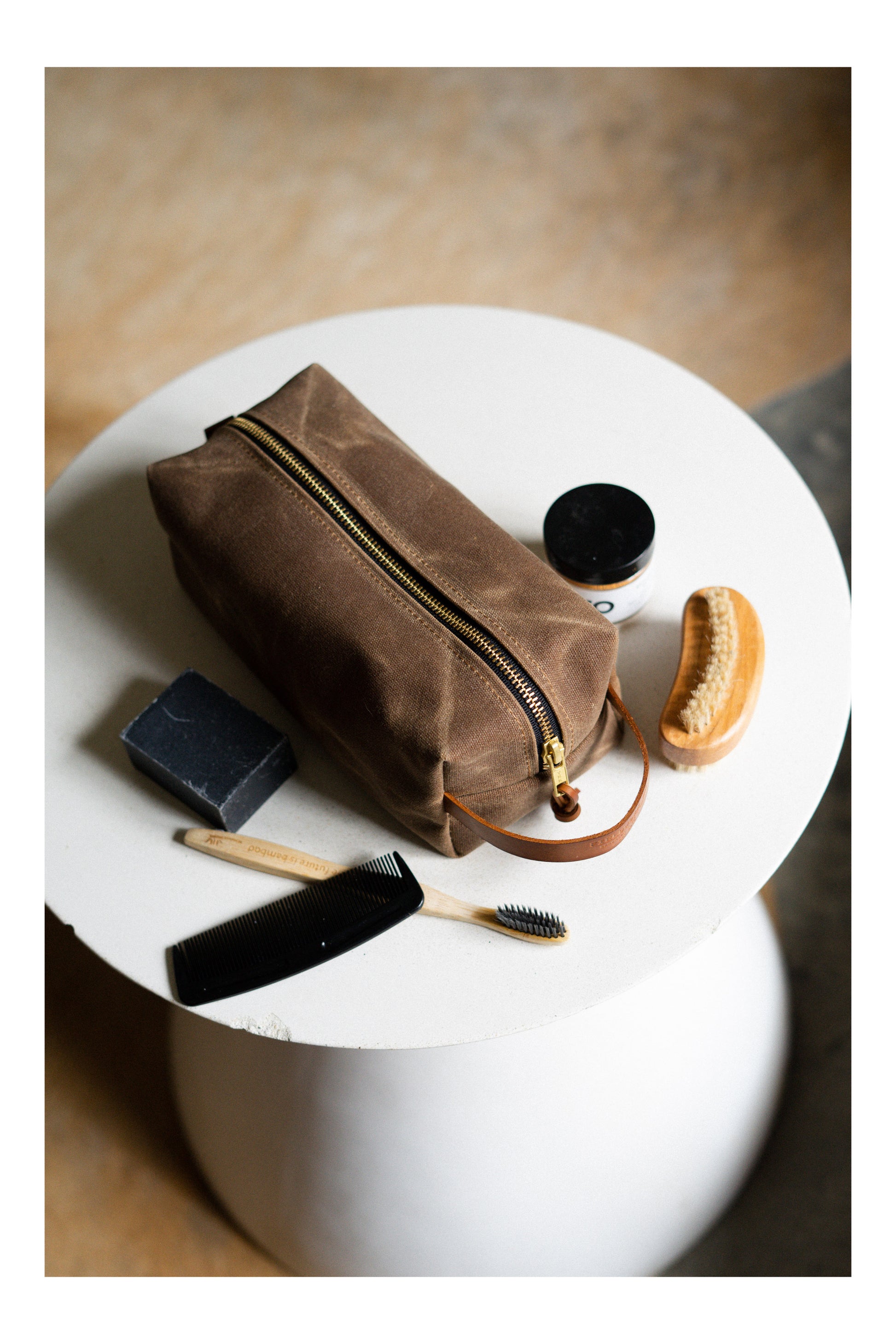 This Dopp Kit is perfect for the weekend traveller. Made out of a rugged 19oz water-resistant waxed canvas and thick vegetable tanned leather handle and details. Accompanied a solid brass YKK zipper. This bag is built to last.