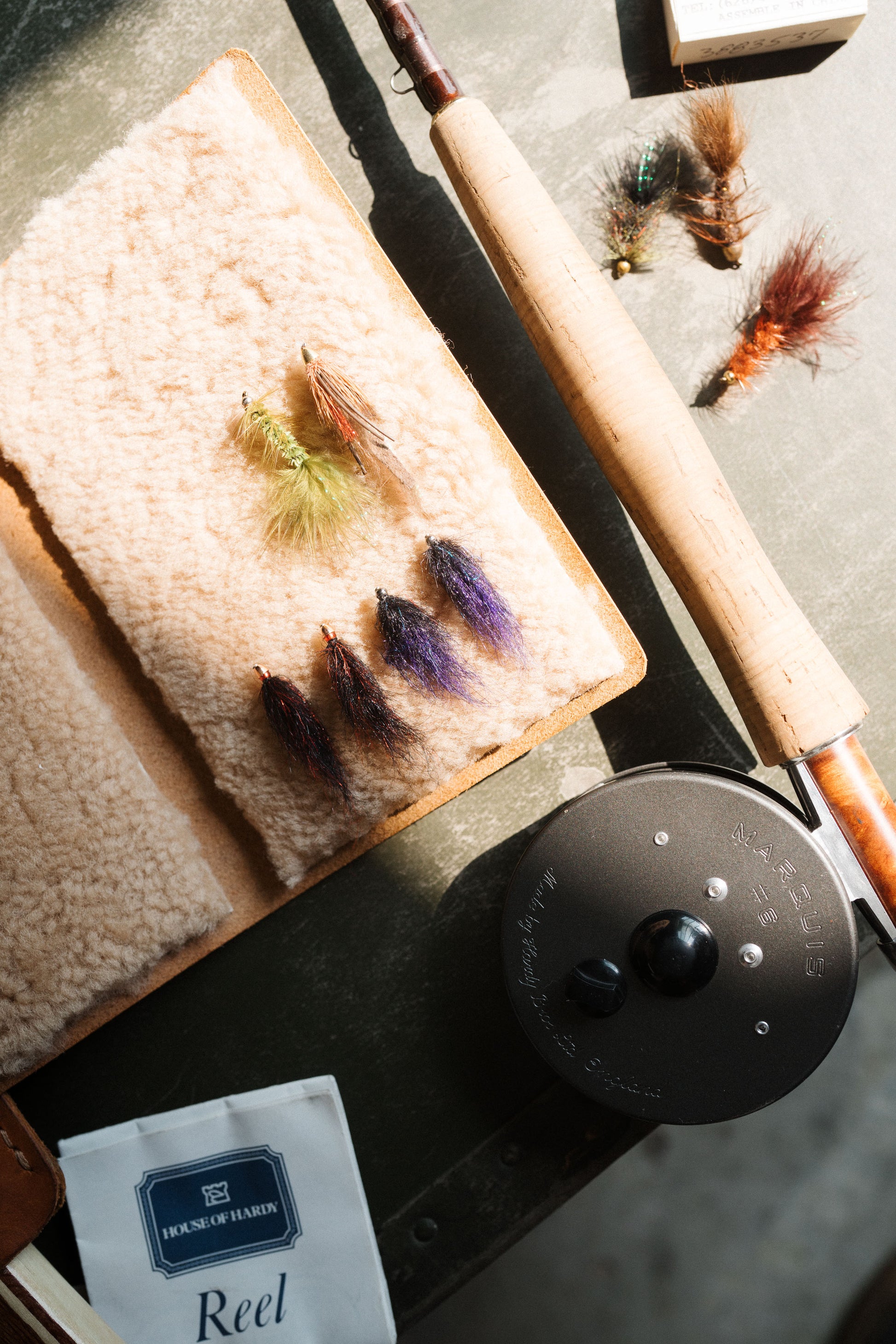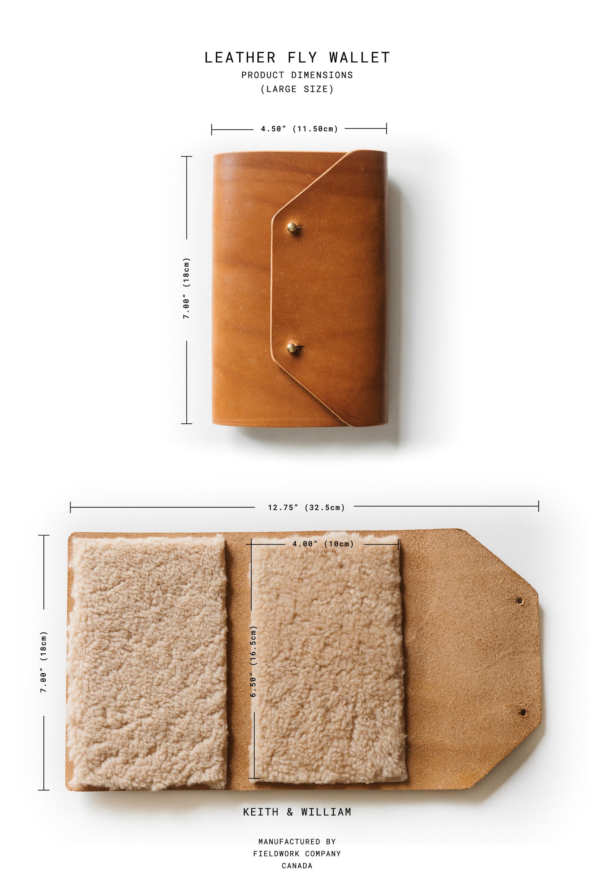 A very simple, yet elegant design; This is our legacy fly wallet, handmade out of premium, 6oz full grain leather matched with high-quality genuine shearling. Finished with two solid brass button studs as the closure