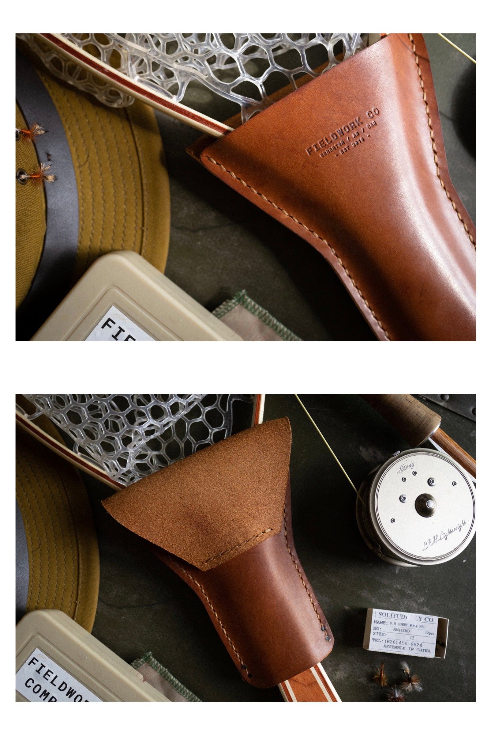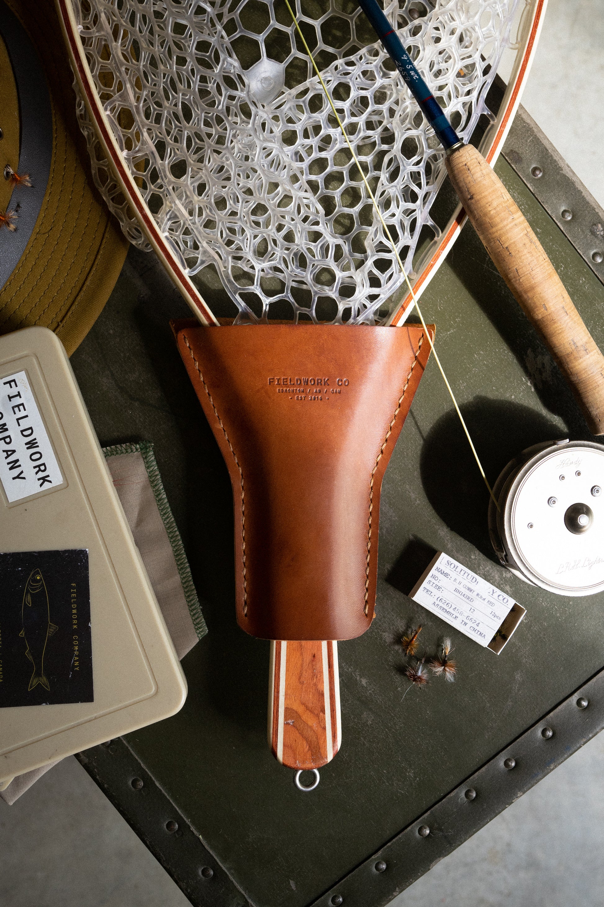 The Legacy leather net holder is designed for the avid fishermen. Whether you're Fly-fishing on a small brook. Or you're throwing lures in deeper water for bigger fish. This net holder allows you to keep your net close to you, while at the same time keeping it contained, and out of the way of casting, or loose fly line