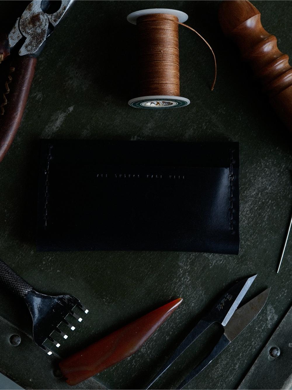 Hand-stitched using flat-waxed Japanese thread. Oiled and conditioned using a beeswax/bergamot blend. It can comfortably hold 5-6 cards and some cash.