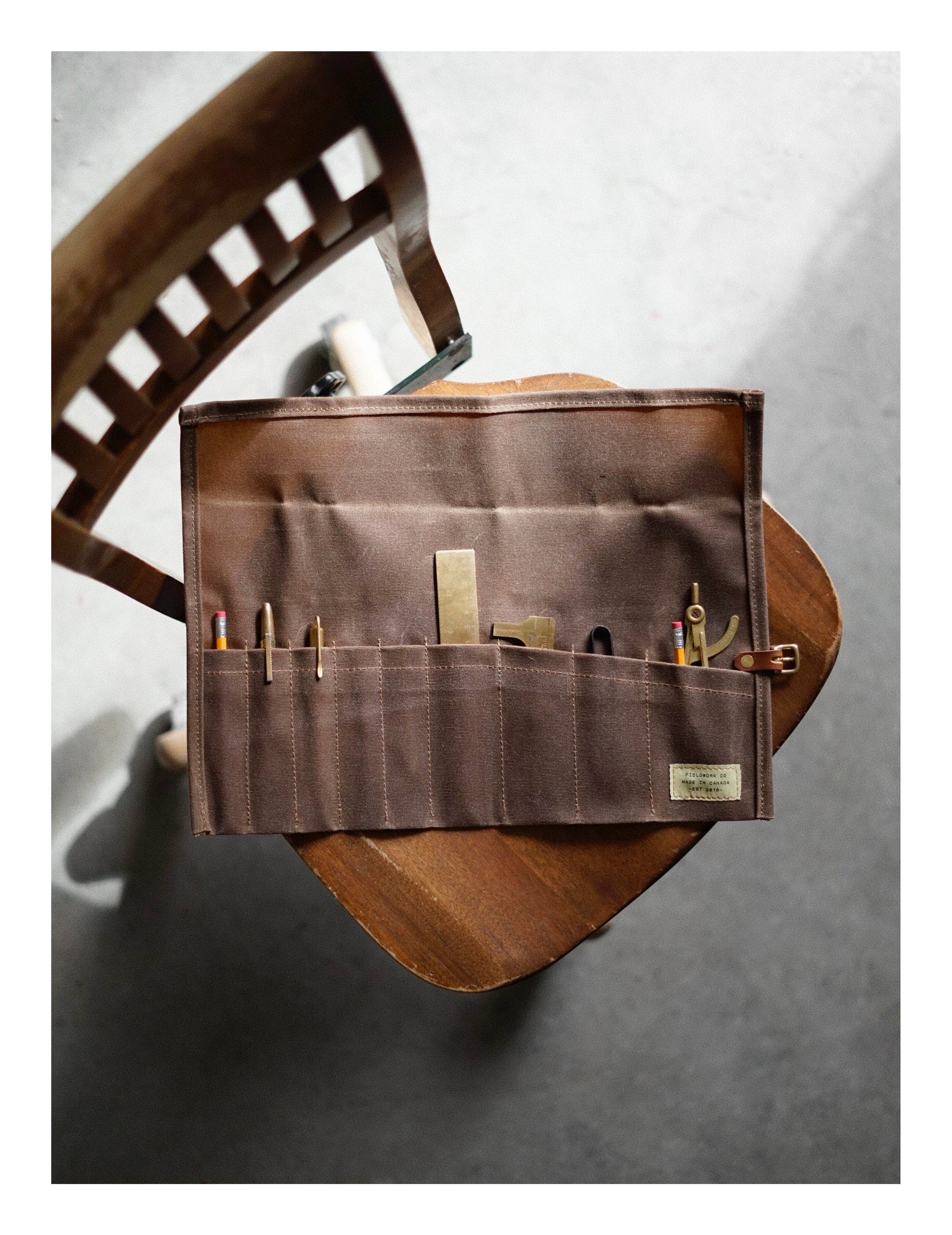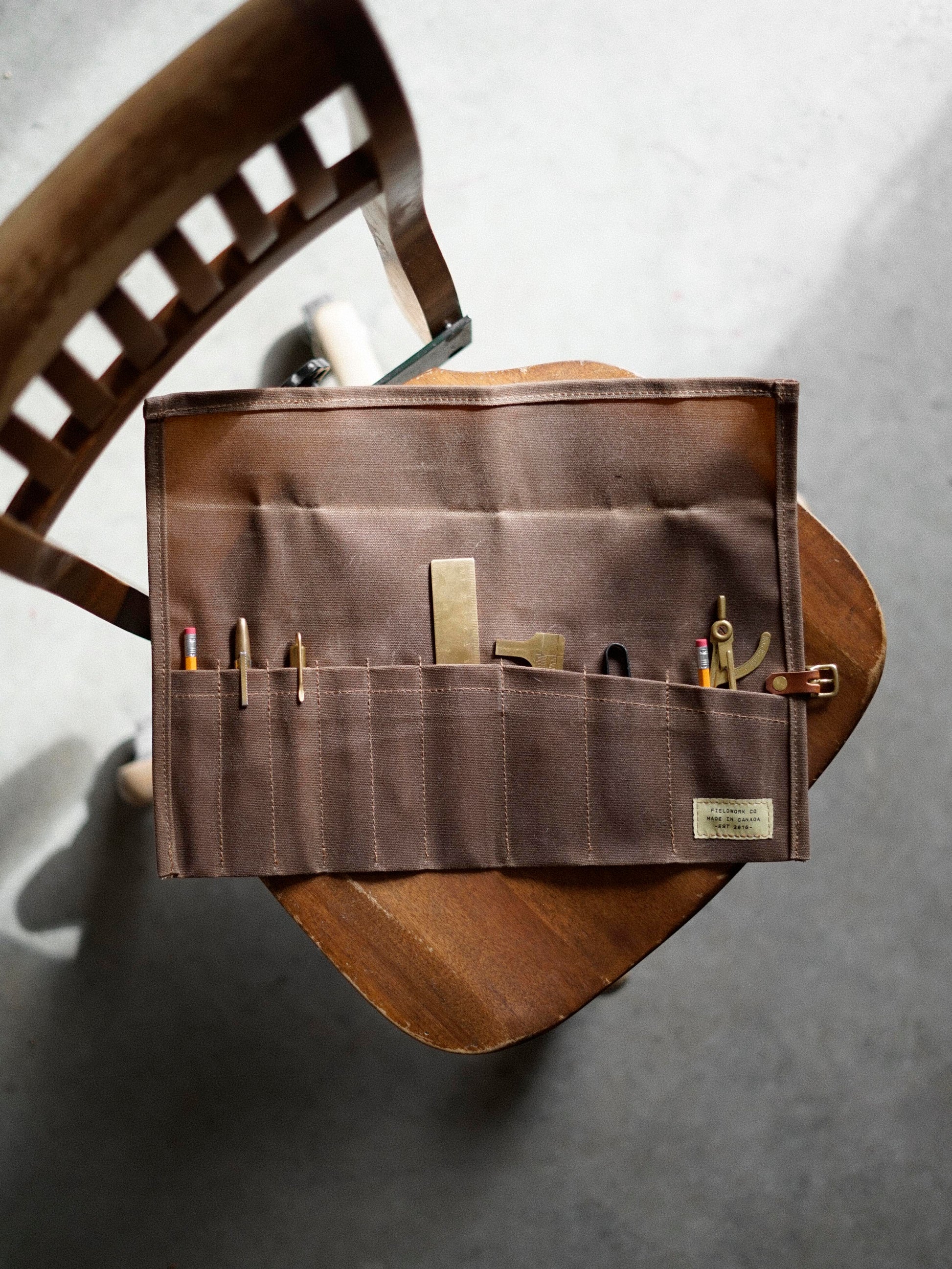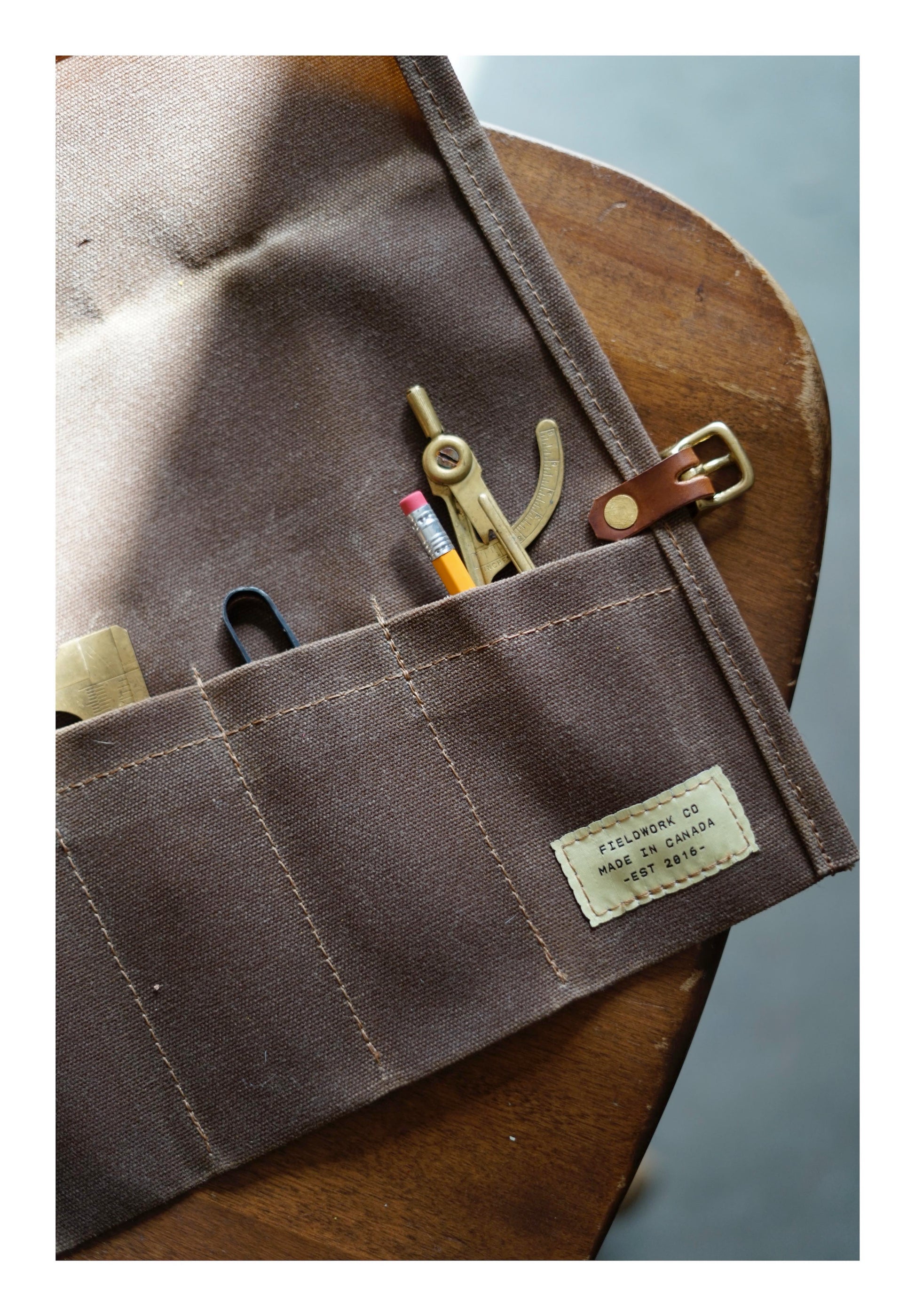 Made out of 19oz durable, and water resistant waxed canvas. Genuine leather and solid brass hardware. With lots of pockets for all your pencils, pens, paint brushes. And anything else you can fit in there