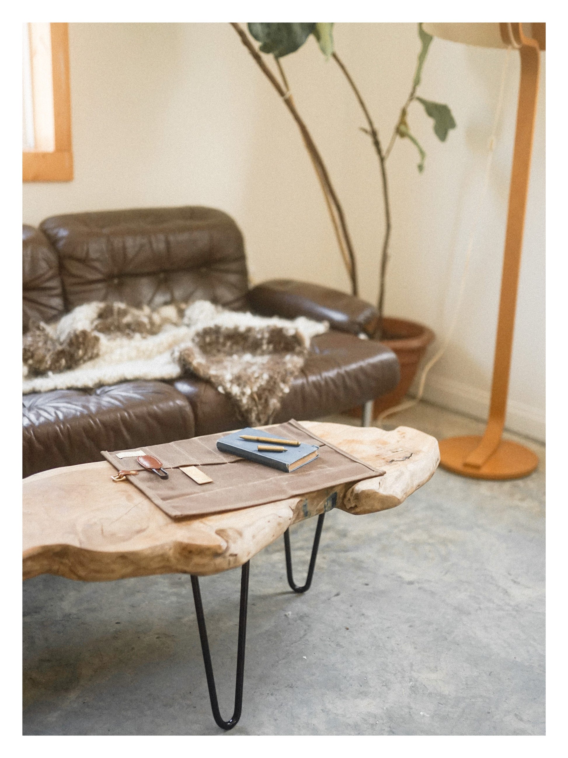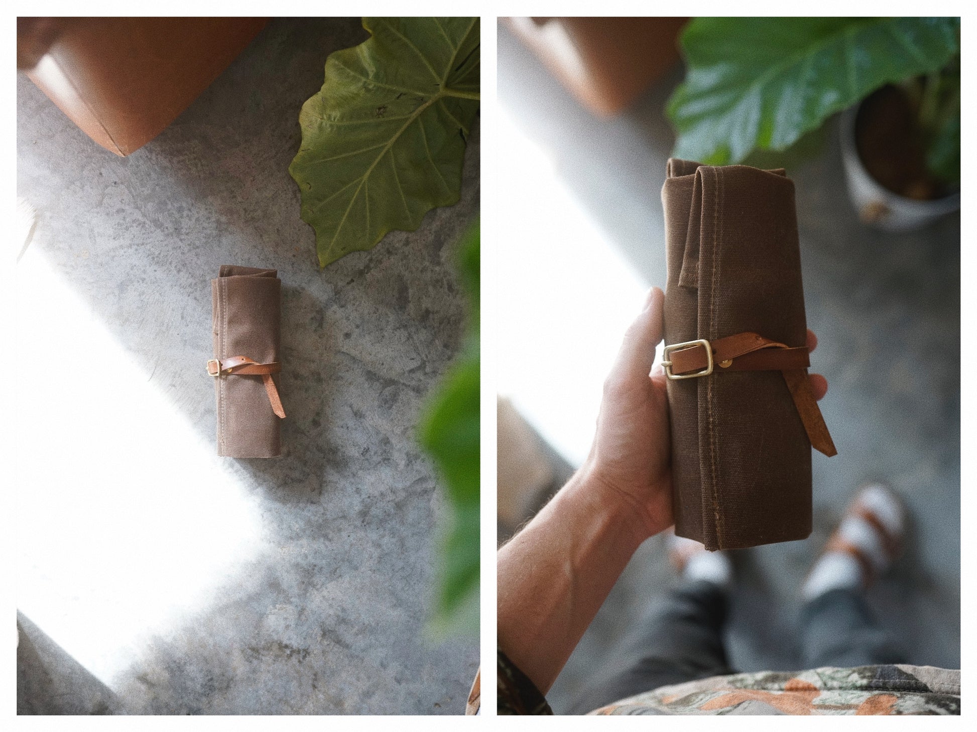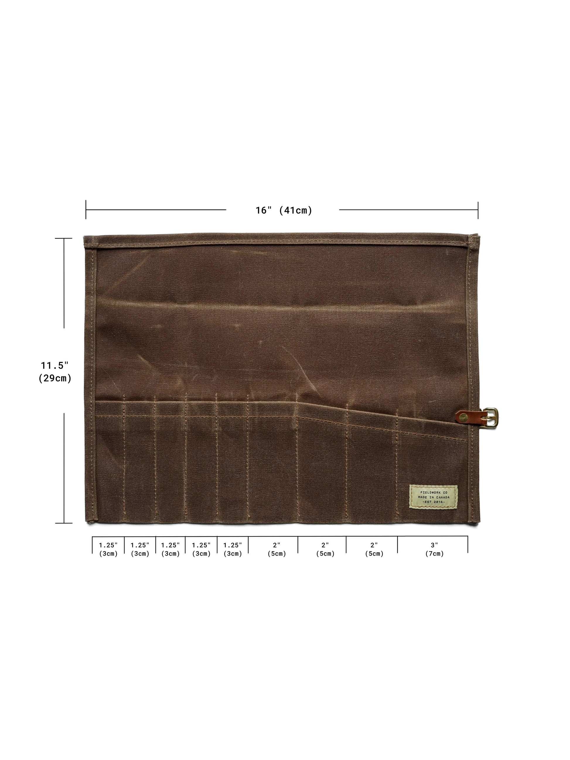 Made out of 19oz durable, and water resistant waxed canvas. Genuine leather and solid brass hardware. With lots of pockets for all your pencils, pens, paint brushes. And anything else you can fit in there